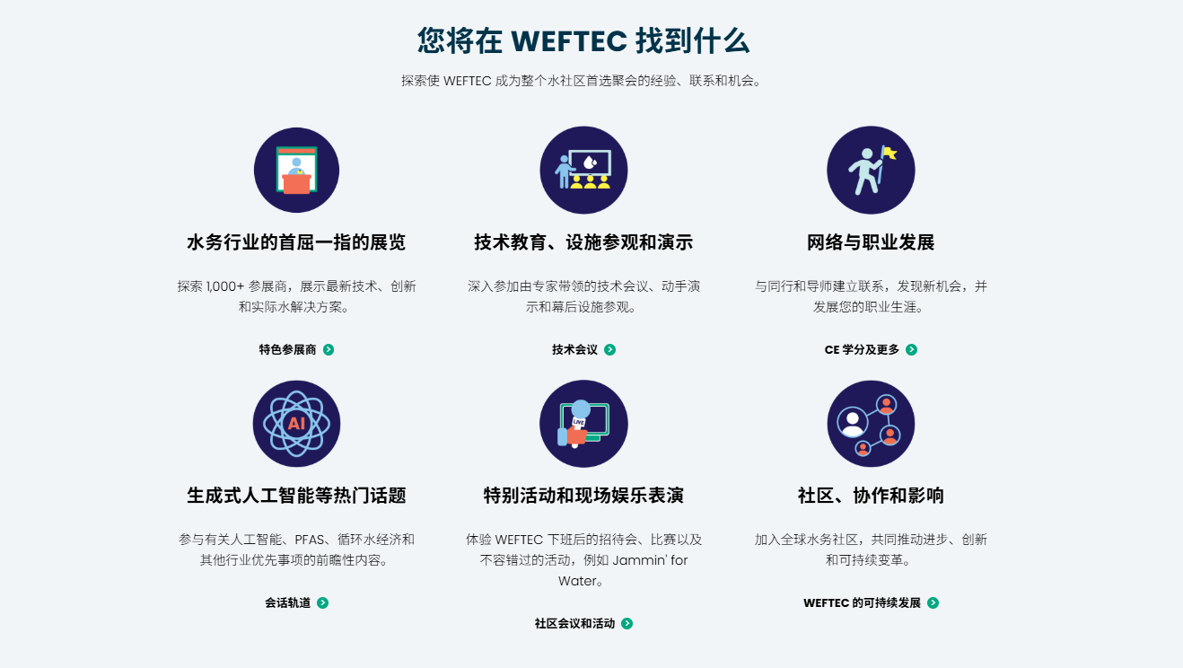 WEFTEC 展览会是全球水处理和环保领域的重要聚焦点之一,吸引了来自全球各地的参展商和专业人士,包括水处理设备制造商、环保技术供应商、政府机构、研究机构等。