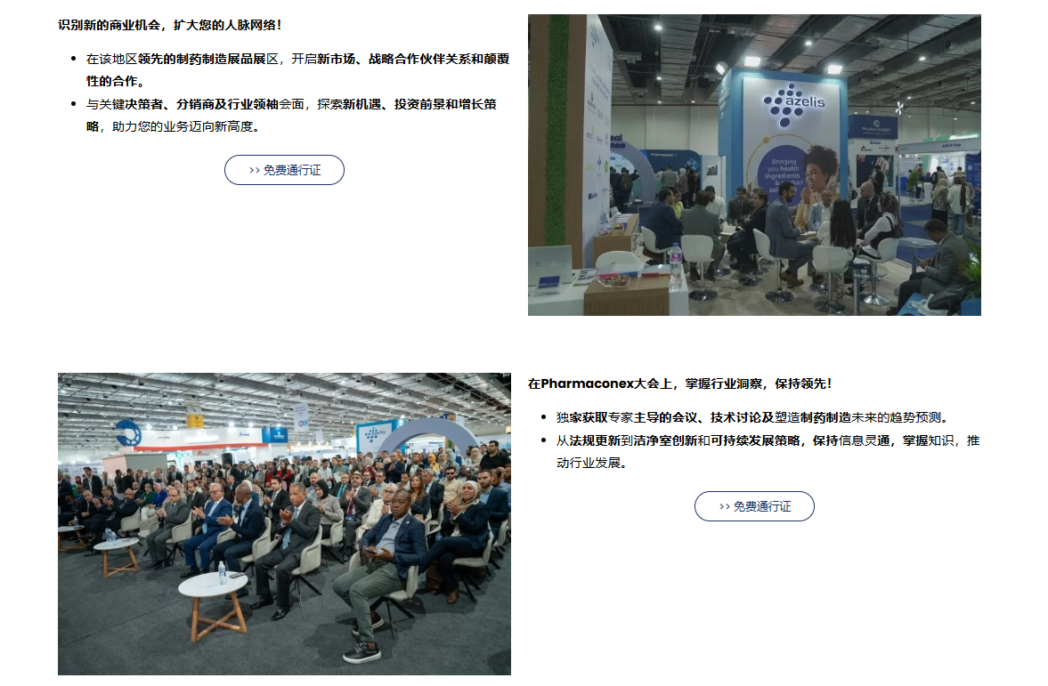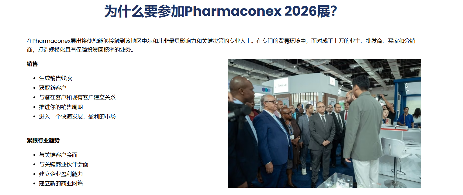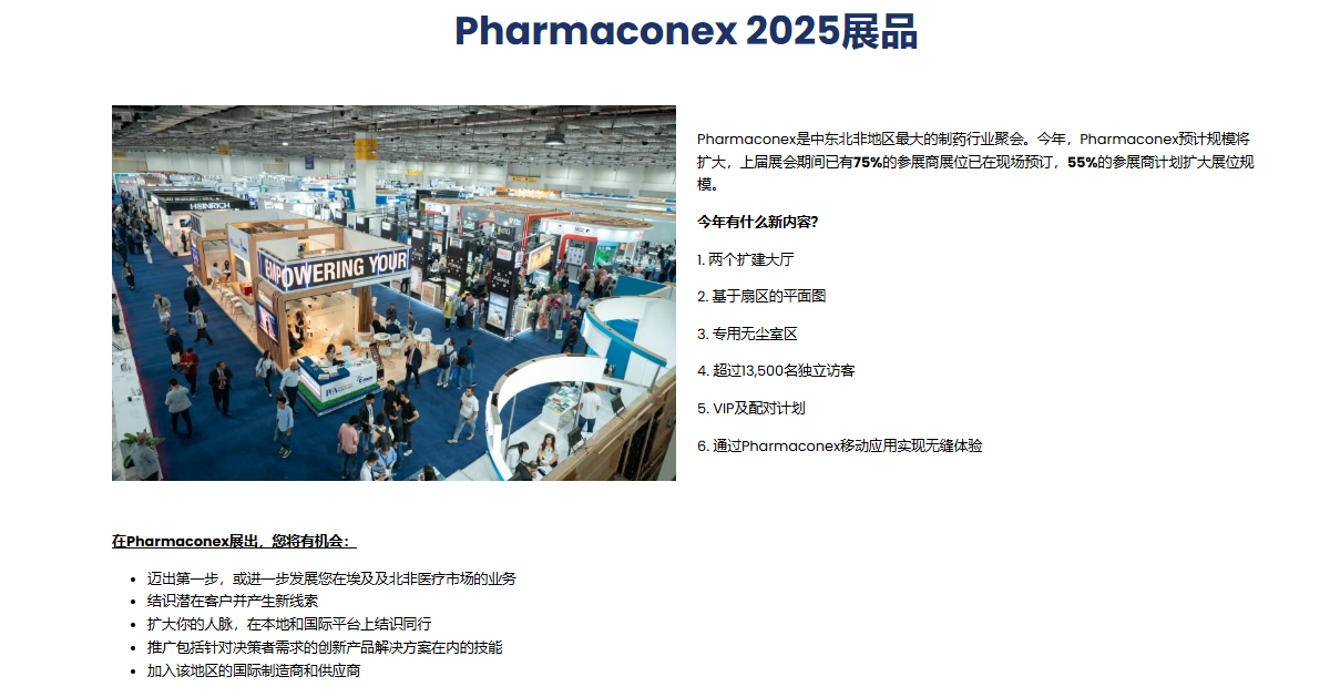 Pharmaconex 是非洲的制药中心,连接着埃及整个供应链,埃及是中东和北非地区最大 的制药市场生产国。为制药界提供全面的体验,围绕最新的行业趋势建立联系和建立知识。 Pharmaconex 是埃及最著名的制药原料及技术展览会,由英国著名展览公司英富曼主办, 拥有丰富的组展经验和强大的实力。该展会自举办以来,一直以其优质的资源和专业的服 务,在满足中东和北非市场需求的同时,为制药、原材料、药品包装等企业提供与埃及地 区及周边国家拓展新业务网络的机会,并建立了一体化解决方案的商务平台。 作为北非乃至中东地区为数不多的成熟制药工业展,Pharmaconex 已成为非洲地区最大 的展会之一,为制药行业的进步作出了重要贡献。开罗医药原料展 Pharmaconex 凭借优 质资源满足中东北非地区市场需求,同时也为医药、原料、医药包装等。企业将有机会拓 展与埃及地区及周边国家的新业务网络,并建立一个具有综合解决方案的完善商业平台。