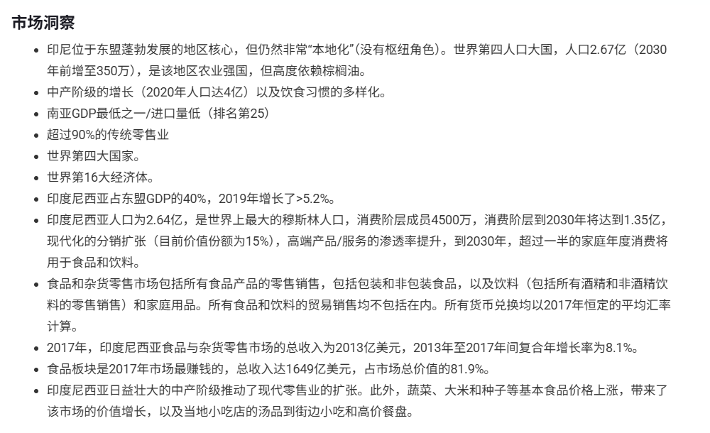 印度尼西亚有 2.64 亿人口,是世界上最大的穆斯林人口,消费阶层有 4500 万人,到 2030 年消费阶层将达到 1.35 亿,现代分销扩张(目前价值份额为 15%)和优质产品/服务的渗透率不断提高,到 2030 年,家庭年度支出中将有一半以上用于食品和饮料。
